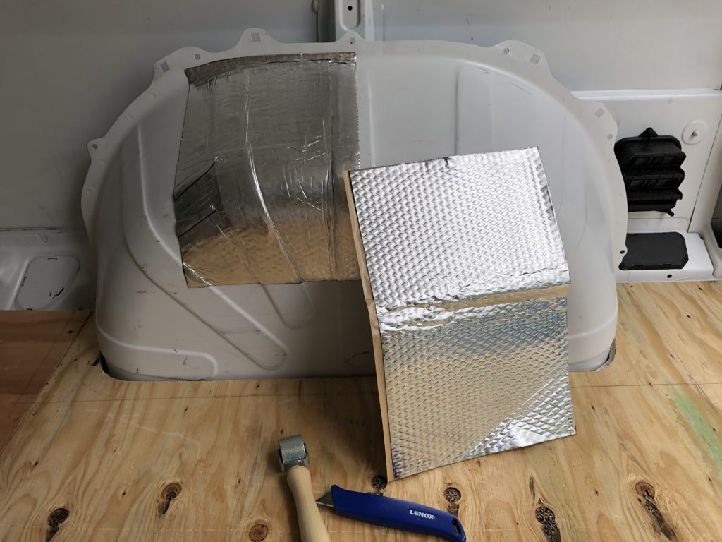 Apply sound-deadening stick-on stuff to the wheel wells.  Don't touch it or it will stick to your fingers.  Then burnish into every crack and crevice, seam and fold with the roller... harder... harder... HARDER... HARDER!!!